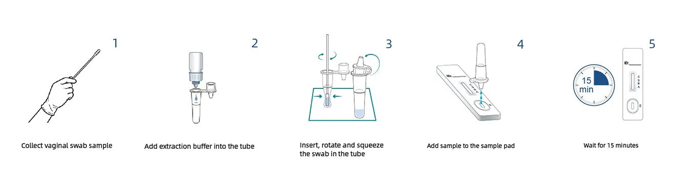 If present, target antigens (Candida, T. vaginalis, G. vaginalis) bind to their corresponding red latex-labeled antibodies in the conjugate pad.